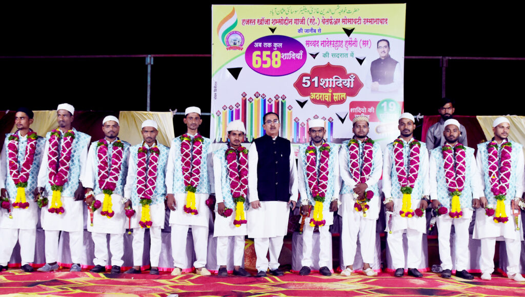 हजरत खाजा शमशोद्दीन गाजी रहे. वेलफेअर सोसायटी उस्मानाबाद च्या सामुदायीक विवाह सोहळ्यात १२ जोडप्यांनी बांधल्या रेशीम गाठी