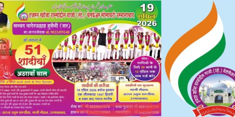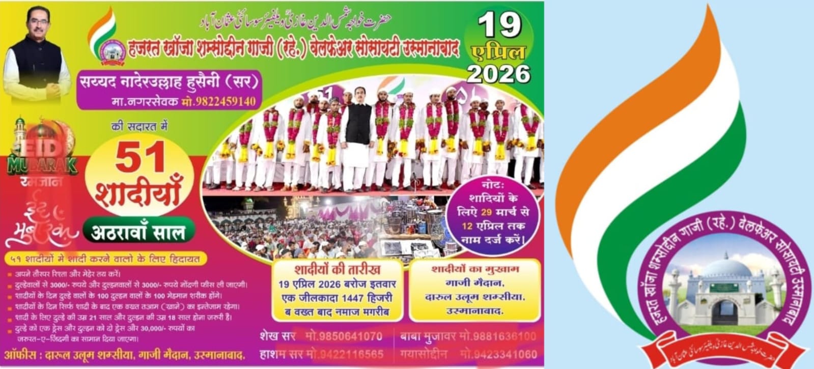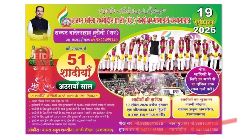हजरत ख्वाजा शमशोद्दीन गाजी (रहे) वेल्फेअर सोसायटी, उस्मानाबाद यांच्या वतीने मागील १८ वर्षांपासून अविरत सुरू असलेला मुस्लिम समाजाचा सामुदायिक विवाह सोहळा यंदाही मोठ्या उत्साहात आयोजित करण्यात येणार आहे. समाजातील गरजवंत कुटुंबांसाठी हा उपक्रम मोठा आधार ठरत आहे.